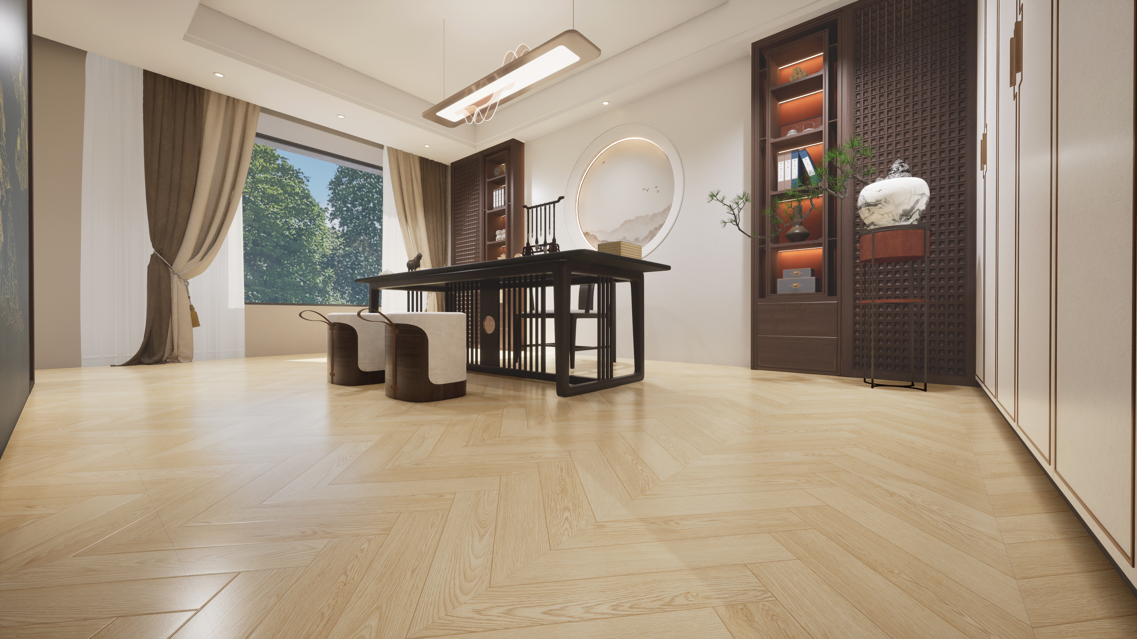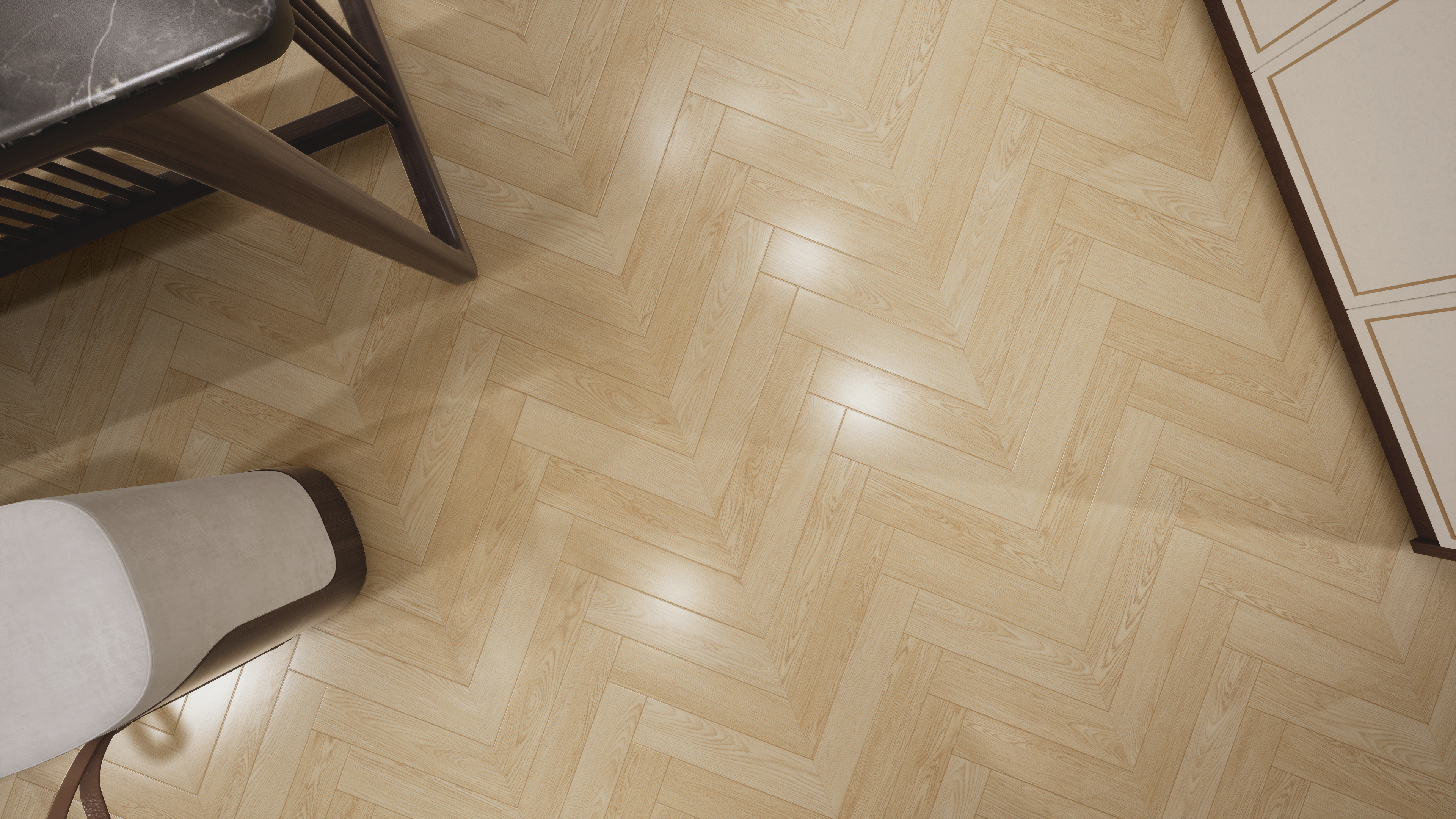 人字拼木美學,立體魚骨紋路錯落交疊 賦予地面動態視覺層次 小空間顯通透質感,大宅更顯優雅格調